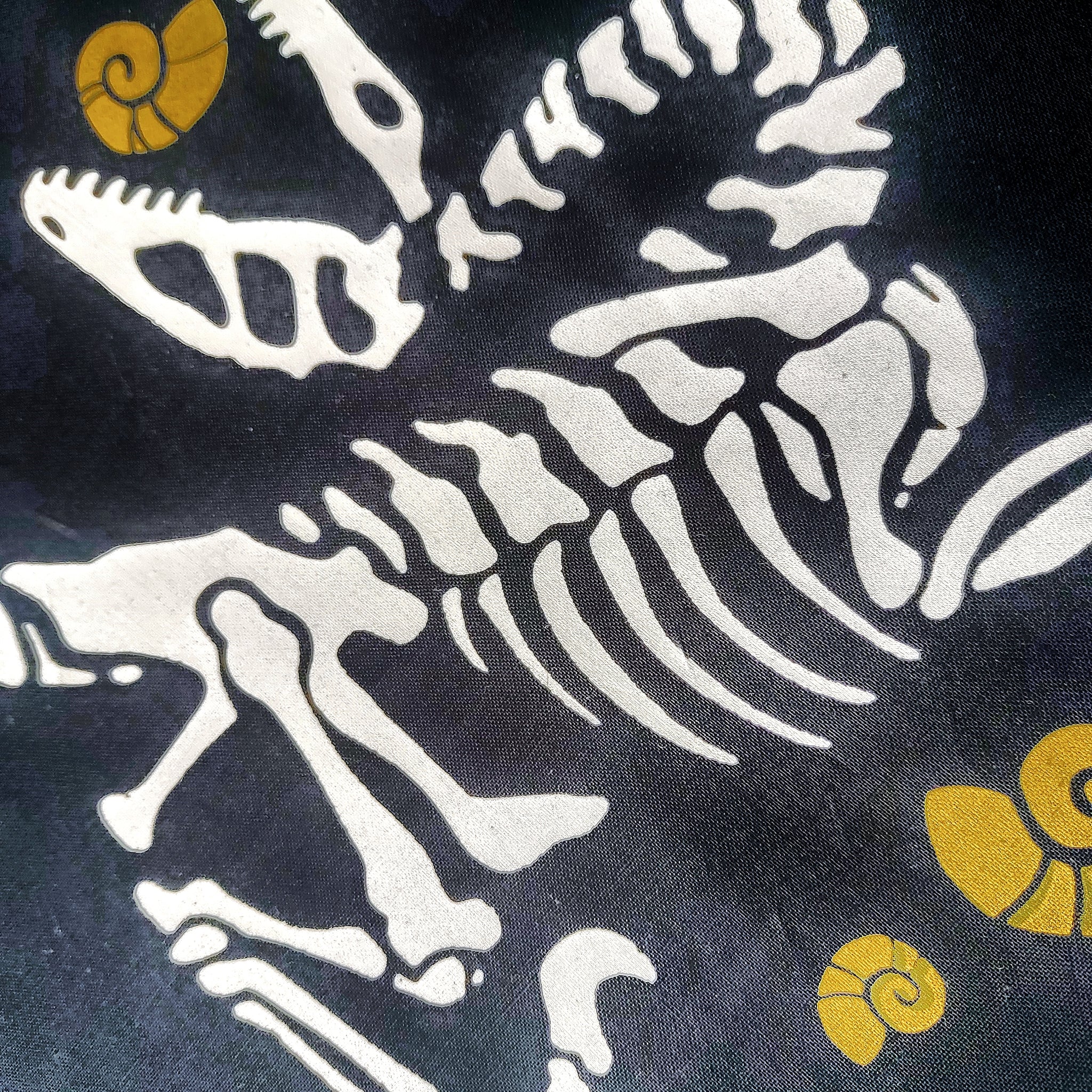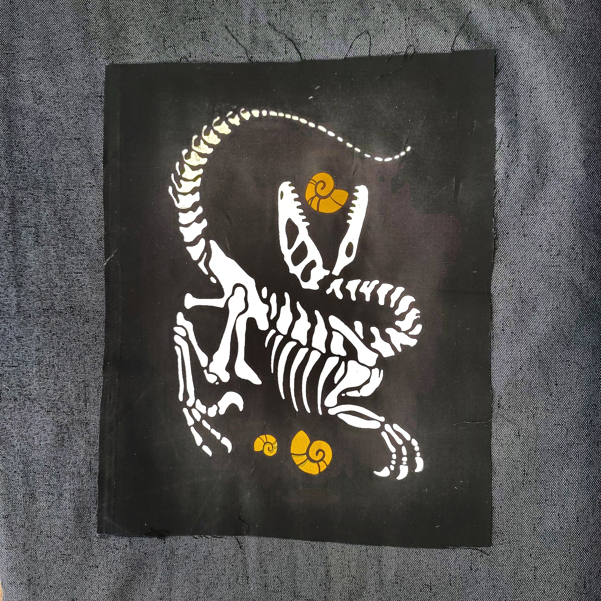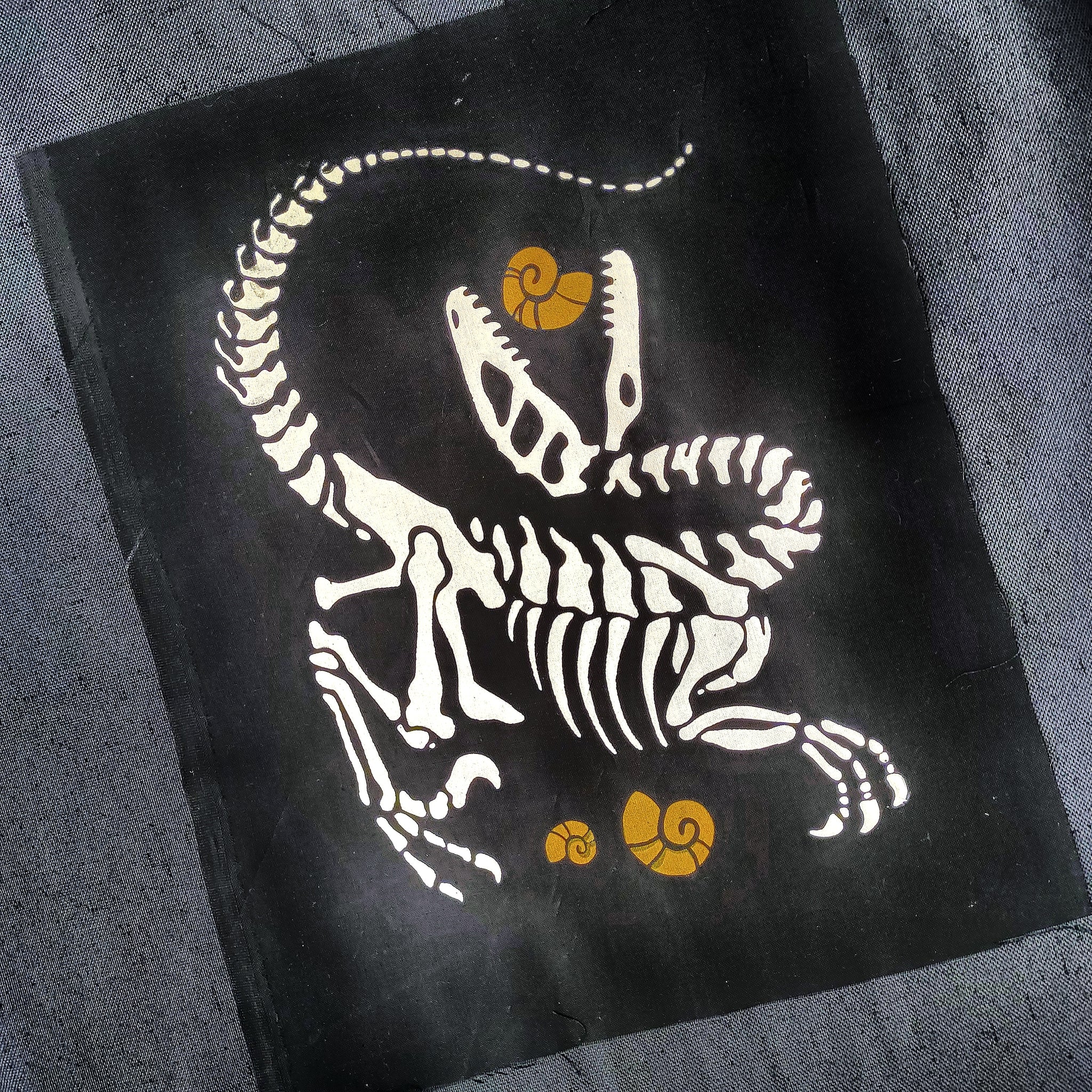 A soft fabric patch of a raptor in an opisthotonic death pose, with ammonite accents.